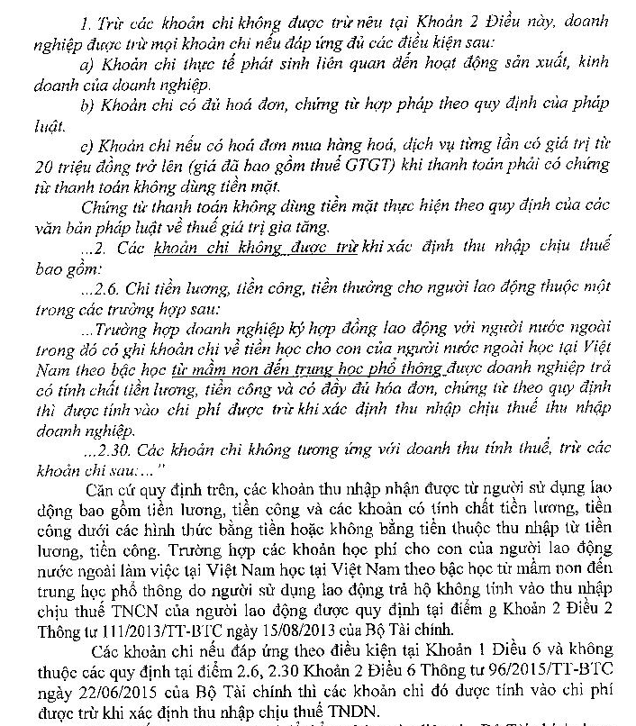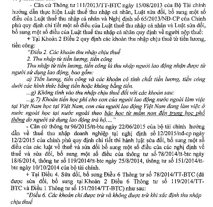 Kính gửi Bộ tài chính! Trong quá trình làm công tác kế toán tại doanh nghiệp, tôi gặp một vấn đề thắc mắc và vẫn chưa tìm được quy định cũng như công văn hướng dẫn rõ ràng vấn đề này như sau: - Theo quy định tại Điểm g.7 Khoản 2 Điều 2 Thông tư 111/2013/TT-BTC Các khoản thu nhập chịu thuế ... 2. Thu nhập từ tiền lương, tiền công g) Không tính vào thu nhập chịu thuế đối với các khoản sau: ... g.7) Khoản tiền học phí cho con của người lao động nước ngoài làm việc tại Việt Nam học tại Việt Nam, con của người lao động Việt Nam đang làm việc ở nước ngoài học tại nước ngoài theo bậc học từ mầm non đến trung học phổ thông do người sử dụng lao động trả hộ. Vấn đề tôi chưa rõ là, công ty tôi phát sinh 2 loại học phí chi cho con người lao động nước ngoài làm việc tại Việt Nam đang theo học tại Việt Nam với bậc học từ mầm non đến trung học phổ thông, chi trả trực tiếp cho trường/ trung tâm và có hóa đơn, chứng từ đầy đủ như sau: - Loại học phí số 1: Học phí tại trường được thu theo quy định của trường, dựa trên thông báo đóng học phí và hóa đơn chứng từ (được nhận sau khi thanh toán) - Loại học phí số 2: Học phí tại trung tâm ngoại ngữ, trung tâm bổ trợ kiến thức khác mà những trung tâm này kết hợp chương trình đào tạo với nhà trường, học phí được công ty chúng tôi chuyển khoản trực tiếp vào tài khoản của trung tâm đào tạo. Con cái của người lao động nước ngoài được công ty chúng tôi hỗ trợ tiền học phí theo học tại các trung tâm này theo các bậc học phù hợp được trung tâm tổ chức đào tạo theo lứa tuổi và trình độ của học viên từ mầm non đến trung học phổ thông Vậy tôi muốn hỏi khoản học phí số 2 có được tính vào các khoản KHÔNG chịu thuế TNCN không? những khoản đó có được tính vào chi phí hợp lý khi tính thuế TNDN của công ty không nếu những khoản này được quy định rõ ràng trong quy chế tiền lương và hợp đồng lao động Rất mong sớm nhận được sự phản hồi hỗ trợ của Bộ tài chính Trân trọng cám ơn!