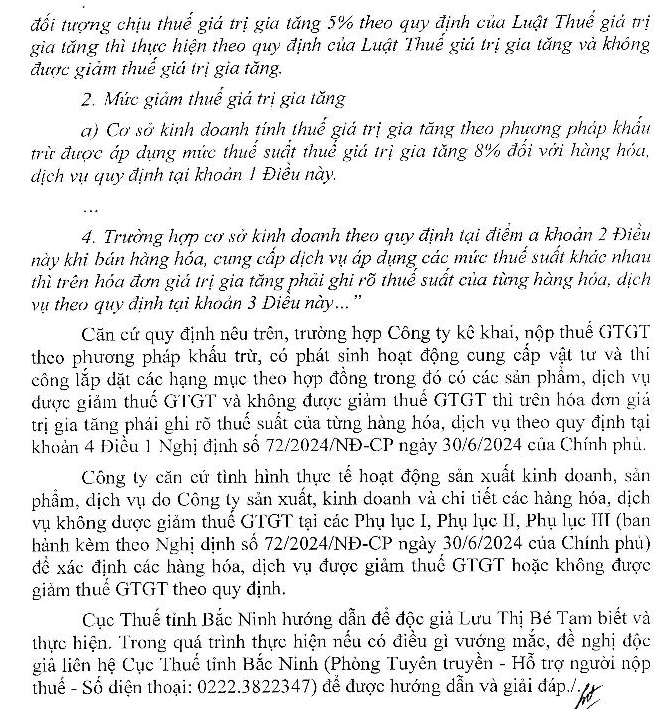 Kính gửi bộ tài chính và tổng cục thuế. Tôi đang công tác tại Công ty TNHH xây dựng Việt Panel (Bắc Ninh). Tôi có câu hỏi liên quan đến chính sách thuế rất mong nhận được câu trả lời. Công ty TNHH Xây dựng Việt Panel (Bắc Ninh) ký kết hợp đồng kinh tế: Cung cấp vật tư và thi công lắp đặt hạng mục cửa an ninh, điện, khí nén, cho Dự án Công Ty TNHH Amphenol Communication Electronics Việt Nam – Lô CN10, KCN Yên Phong mở rộng, xã Thụy Hòa, Huyện Yên Phong, tỉnh Bắc Ninh Đến tháng 7/2024, Công ty đã hoàn thành 80% khối lượng công việc và đang thực hiện công tác nghiệm thu giai đoạn. Theo điều khoản của hợp đồng, giai đoạn này Công ty phải xuất hóa đơn cho bên B. Trong báo giá Công ty có báo giá tổng hợp, chỉ rõ giá trị vật liệu và giá trị nhân công, ghi chung một mức thuế suất giá trị gia tăng (GTGT) 10% cho toàn bộ hàng hóa, dịch vụ. Các vật liệu chính cung cấp là: + Cổng xoay 3 càng (vật liệu chính thép không rỉ và bảng mạch in diện tử) mã ngành 241- sản phẩm gang, sắt, thép. Mã ngành 2630 – Thiết bị truyền thông. + Cáp điện đồng trục – Mã ngành 2732 – Dây cáp điện và điện tử khác. + Tủ điện phân phối (Vật liệu chính vỏ bằng thép sơn tĩnh điện, tụ điện, cầu chì, thanh cái đồng, attomat…) thuộc mã ngành 2970- Thiết bị điện khác + Ống thép không rỉ và phụ kiện nối ống (Vật liệu chính là sắt, thép) mã ngành 241 – sản phẩm gang, sắt, thép. + Thang máng cáp và phụ kiện (vật liệu chính là sắt, thép) mã ngành 241- sản phẩm gang, sắt, thép. Theo Công ty tra cứu mã danh mục thì vật tư thuộc mã ngành nêu trên, không được giảm thuế. Phần dịch vụ thi công, lắp đặt thuần túy là chi phí nhân công, thuộc mã ngành 4330, được giảm thuế. Khối lượng nghiệm thu theo khối lượng vật tư thực tế cấp và thi công lắp đặt hoàn thiện. Vậy Công ty xuất hóa đơn giai đoạn này có được hưởng thuế suất là 8% cho toàn bộ giá trị vật tư và nhân công hay không? Nếu hàng hóa và dịch vụ được hưởng mức thuế suất khác nhau thì Công ty phải xuất tách 2 hóa đơn riêng biệt cho khách hàng (1 hóa đơn vật tư 10% và 1 hóa đơn nhân công 8%) có đúng không?