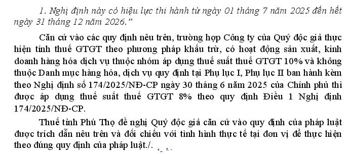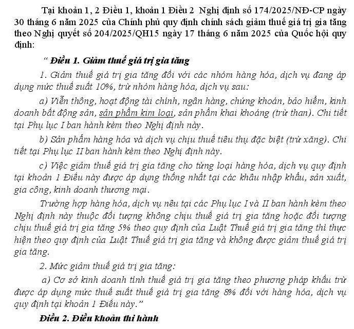 Kính gửi: Bộ Tài Chính Công ty chúng tôi hiện đang gặp vướng mắc trong quá trình xác định và áp dụng mức thuế suất thuế giá trị gia tăng (GTGT) theo quy định tại Nghị định số 174/2025/NĐ-CP ngày 30/6/2025 của Chính phủ, hướng dẫn thi hành chính sách giảm thuế GTGT theo Nghị quyết số 204/2025/QH15 ngày 17/6/2025 của Quốc hội. 1. Thông tin về hoạt động sản xuất, kinh doanh của Công ty như sau: • Ngành nghề đăng ký kinh doanh: 2591, 2592, 4530, 4543, 2599, 3311, 2930 (theo Giấy xác nhận đăng ký ngành nghề kinh doanh). • Mã HS thường sử dụng trong khai báo hải quan đối với sản phẩm nhập khẩu: 73181510, 73181610, 73182100, 73182200, 73182400, 73182910, 82073000, 82081000. • Quy trình sản xuất chính: Dây thép, thép ống, ống inox (đường kính nhỏ hơn 30mm) → tạo hình nguội (cắt, chuốt, đùn, đột, dập, cán, ép) → gia công cơ khí (phay, tiện, cắt gọt, mài, đánh bóng) → tôi luyện ở nhiệt độ cao → tráng phủ bề mặt (mạ, phủ keo, sơn, phủ Geomet – có sử dụng nguyên vật liệu phụ như hóa chất, kẽm, sơn) → kiểm tra chất lượng → đóng gói → bán hàng. • Tên gọi sản phẩm: bu lông, đai ốc, vít, chốt gài, vòng đệm, trục xe, đinh tán, vòng chặn. • Ứng dụng: dùng để liên kết, cố định chi tiết hoặc bộ phận trong các sản phẩm như xe máy, ô tô, động cơ, máy móc, thiết bị công nghiệp... 2. Vướng mắc về chính sách thuế: Căn cứ theo nội dung Nghị định số 174/2025/NĐ-CP và đối chiếu với Phụ lục I (Danh mục hàng hóa, dịch vụ không được giảm thuế GTGT) ban hành kèm theo Nghị định, chúng tôi nhận thấy ngành nghề sản xuất kinh doanh của Công ty không nằm trong danh mục loại trừ, do đó có thể thuộc đối tượng áp dụng thuế suất 8% từ ngày 01/7/2025. Tuy nhiên, tại Khoản 1 Điều 1 Nghị quyết số 204/2025/QH15 và Điểm a, Khoản 1, Điều 1 Nghị định số 174/2025/NĐ-CP có quy định loại trừ một số nhóm ngành khỏi đối tượng giảm thuế, trong đó bao gồm: “sản phẩm kim loại”, “sản phẩm khai khoáng (trừ than)”,... Do sản phẩm của Công ty được chế tạo từ kim loại, nhưng có quy trình gia công sâu, giá trị gia tăng cao, ứng dụng rõ ràng, nên chúng tôi chưa rõ việc này có bị coi là "sản phẩm kim loại" thuần túy để bị loại trừ khỏi diện giảm thuế hay không. 3. Kiến nghị: Hiện nay, Công ty có nhiều đơn hàng phát sinh liên tục mỗi ngày. Để đảm bảo tuân thủ đúng quy định pháp luật, đồng thời hạn chế rủi ro sai sót trong kê khai và xuất hóa đơn thuế GTGT, kính đề nghị Bộ Tài Chính xem xét, hướng dẫn cụ thể về: • Các sản phẩm bu lông, ốc vít, chốt, đai, trục... như nêu trên có được áp dụng thuế suất GTGT 8% theo Nghị định số 174/2025/NĐ-CP hay không? • Nếu không, đề nghị chỉ rõ cơ sở pháp lý hoặc danh mục mã HS/mã ngành cụ thể để Công ty có căn cứ thực hiện. Kính mong nhận được sự hướng dẫn sớm từ Bộ Tài Chính. Trân trọng cảm ơn!
