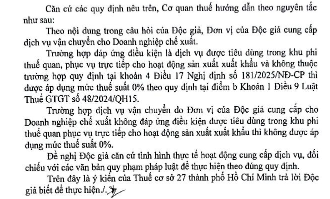 Cụ thể văn bản trả lời số 4287/CTBDU-NVDTPC của Cục Thuế tỉnh Bình Dương cho Chi cục Thuế TP.Thuận An phản hồi dịch vụ vận chuyển hàng hóa phục vụ quá trình xuất nhập khẩu của cty chúng tôi cung cấp cho các DNCX không thuộc đối tượng áp dụng thuế suất 0% (do tuyến đường vận chuyển không nằm trong khu phi thuế quan).