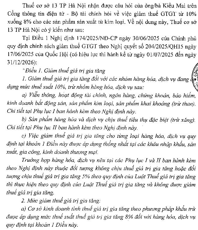 Đơn vị chúng tôi với ngành nghề kinh doanh chính: Bán buôn kim loại khác; bán buôn sắt, thép. Bán buôn vật liệu, thiết bị lắp đặt khác trong xây dựng, xin được hỏi nội dung liên quan đến giảm thuế GTGT, căn cứ Nghị định 174/2025/NĐ-CP ngày 30/06/2025 của Chính phủ quy định giảm thuế giá trị gia tăng đối với các nhóm hàng hóa, dịch vụ đang áp dụng mức thuế suất 10% .