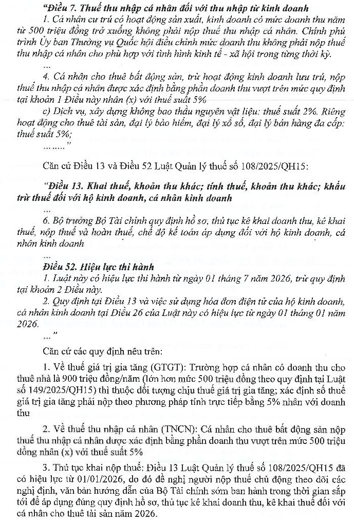 Kính gởi bộ tài chính, tôi ví dụ:1) Nếu tôi có doanh thu cho thuê nhà 900 triệu trong năm 2026, thì thu nhập tính thuế tiền thuê nhà là 400 triệu ( 900 triệu - 500 triệu miễn thuế = 400 triệu) cho cả thu nhập tính thuế TNCN và GTGT có đúng không? và tôi sẽ phải nộp thuế cho thuê nhà là 40 triệu (5% TNCN + 5% GTGT). 2) Nếu doanh thu 900 triệu này thu từ 2 căn nhà cho thuê (mỗi căn thu 450 triệu), địa chỉ 2 căn nhà này trụ ở 2 Phường khác nhau ở TPHCM, cho nên có SỐ ĐUÔI của MST để khai thuế cho thuê 2 nhà sẽ khác nhau. Vậy tôi khai thuế như thế nào? phần miễn thuế 500 triệu sẽ khai cho MST nào? hoặc phân bổ ra sao? Cám ơn