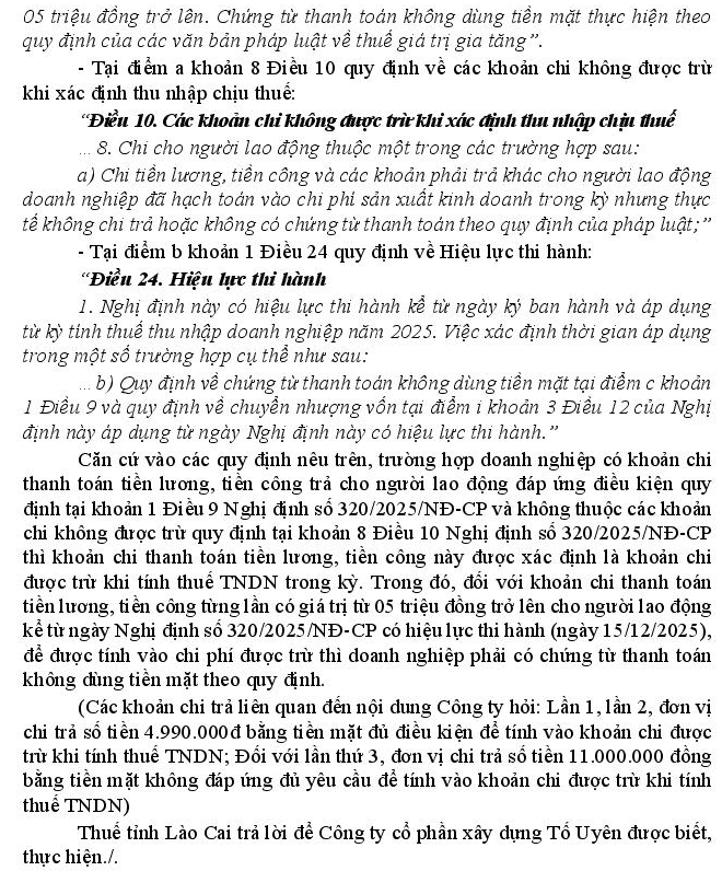 Kính gửi: Bộ Tài chính Công ty cổ phần xây dựng Tố Uyên, mã số thuế: 5300218990, địa chỉ trụ sở: Số nhà 167 đường Ngô Văn Sở, phường Lào Cai, tỉnh Lào Cai, Việt Nam Căn cứ Bộ luật lao động hiện hành Căn cứ Luật thuế TNDN số 67/2025/QH15; Căn cứ Nghị định số 320/2025/NĐ-CP ngày 15 tháng 12 năm 2025 của Chính phủ. Công ty cổ phần xây dựng Tố Uyên trao đổi và xin hỏi Quý cơ quan Bộ tài chính mấy vấn nội dung cụ thể như sau: 1.Hiện nay Doanh nghiệp chúng tôi đang thực hiện chi trả tiền lương, tiền công cho người lao động theo hình thức trả bằng tiền mặt, thu nhập của người lao động giao động từ 11.000.000đ đến 22 triệu đồng/1 tháng tùy từng người và từng vị trí công tác. Xin hỏi tiền lương, tiền công Doanh nghiệp chi trả cho người lao động bằng tiền mặt này có được tính vào chi phí hợp lý khi tính thuế thu nhập doanh nghiệp không? Nếu có thì được quy định ở đâu? Nếu không được tính vào chi phí hợp lý thì quy định ở đâu? 2.Từ Tháng 12 năm 2025 Doanh nghiệp tôi trả tiền lương, tiền công cho người lao động theo hình thức 03 lần/1 tháng cụ thể: - Lần 1 vào ngày mùng 10 hàng tháng số tiền: 4.990.000đ bằng tiền mặt có phiếu chi tiền mặt. Xin hỏi số tiền 4.990.000 đồng chi trả bằng tiền mặt có được tình là chi phợp lý không ? - Lần 2 vào ngày 20 hàng tháng số tiền: 4.990.000đ bằng tiền mặt có phiếu chi tiền mặt. Xin hỏi số tiền 4.990.000 đồng chi trả bằng tiền mặt có được tình là chi phợp lý không ? - Lần 3 vào từ ngày 31 hàng tháng số tiền: 11.000.000đ bằng tiền mặt có phiếu chi tiền mặt. Xin hỏi số tiền 11.000.000 đồng chi trả bằng tiền mặt có được tình là chi phợp lý không ? * Việc chi trả nêu trên được thực hiện theo thỏa thuận 2 bên, giữa Doanh nghiệp với người lao động, các lần thanh toán bằng tiền mặt có đủ chứng từ: bảng thanh toán lương, bảng chấm công, phiếu chi lương cho người lao động. Vậy kính mong Quý ban cơ quan tạo điều kiện giúp đỡ và hướng dẫn chính sách thuế cho đơn vị thực hiện tốt nghĩa vụ thuế. Công ty xin chân trọng cảm ơn Quý cơ quan./.
